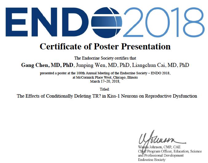 ▲陈刚教授在ENDO 2018(2018年度美国内分泌协会年会)上壁报口头发言《Kiss-1神经元上甲状腺激素受体敲除对生殖的影响》