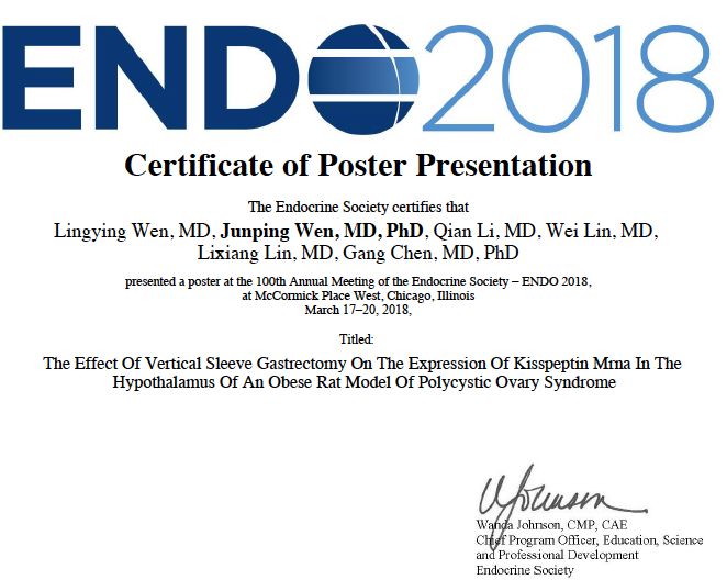 ▲温俊平博士在ENDO 2018(2018年度美国内分泌协会年会)上壁报交流《代谢手术对多囊卵巢综合征kisspeptin表达的基础研究》